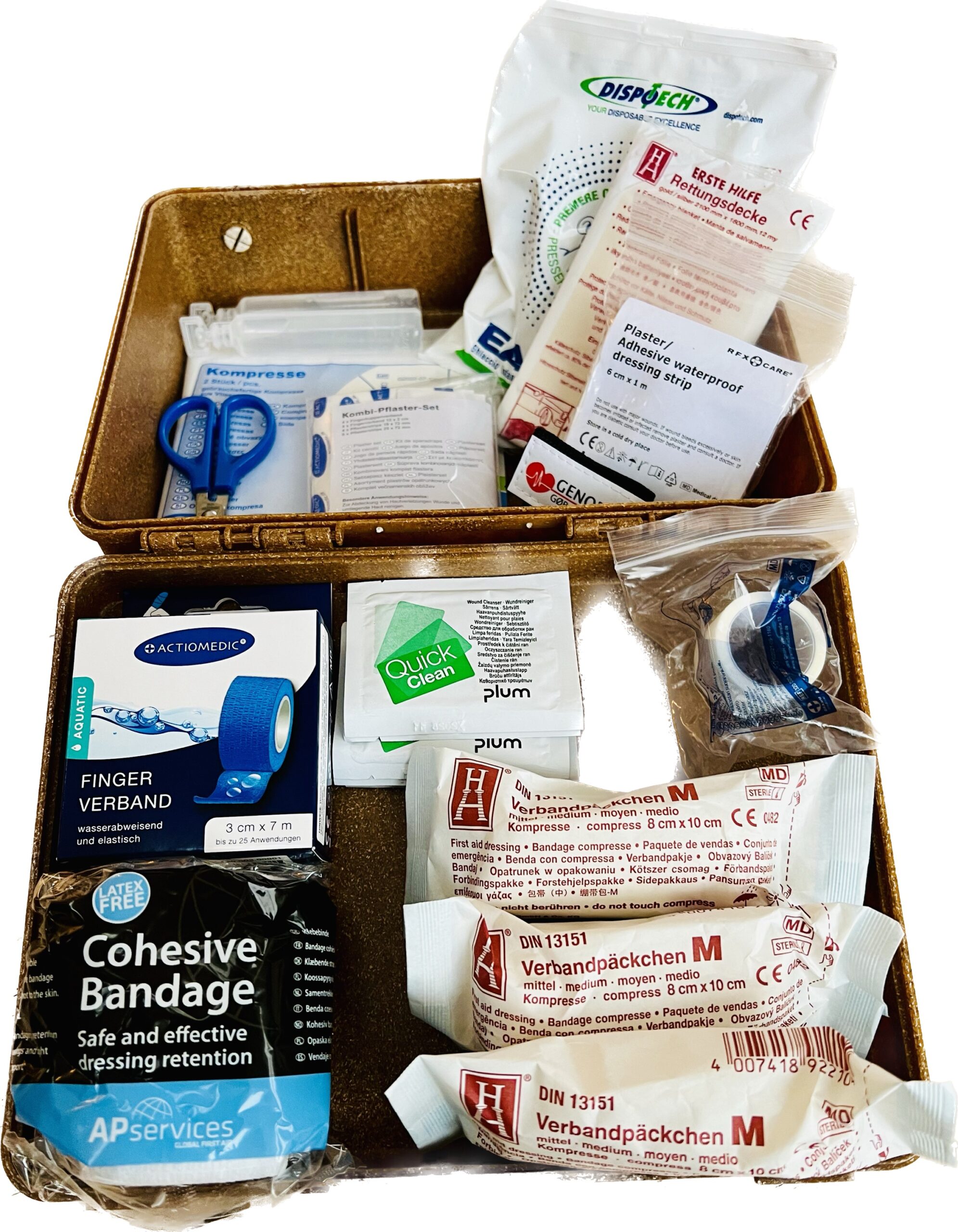 Komplet førstehjælpskasse til behandling af mindre og større skader. F.eks. blødninger, forstuvninger og forbrændinger.