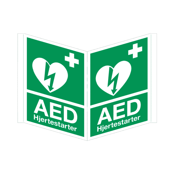Dette trekantede vinkelskilt markerer tydeligt placeringen af en hjertestarter. Uden en klar markering kan det føre til forvirring og problemer for førstehjælperen. Skiltet er designet, så det kan ses fra begge sider, hvilket gør det nemt at finde hjertestarteren. I mørke omgivelser er skiltet selvlysende.