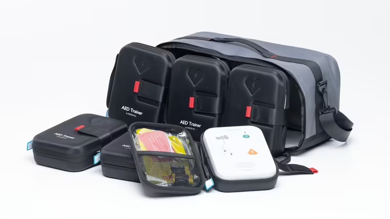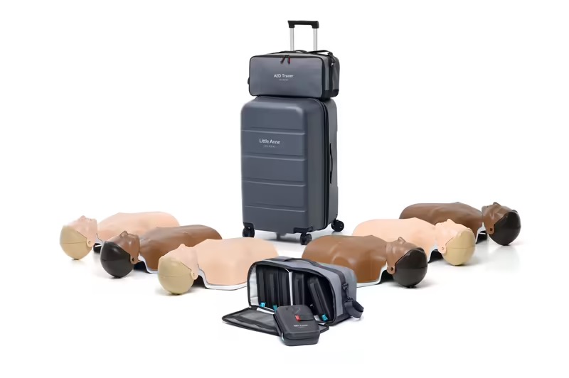 - AED Transport taske for 6 enheder. En transporttaske til et klassesæt af hjertestarter-trænere, der kan indeholde op til 6 hjertestarter-trænere. Der findes en aftagelig skillevæg inde i tasken, så det er muligt at transportere 3 hjertestarter-trænere. Tasken kan stables oven på Little Anne-kufferten.